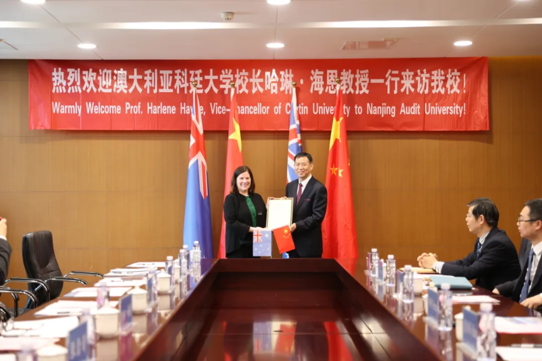 会上,举办科廷大学校长哈琳·海恩受聘南京审计大学荣誉教授仪式,董必荣为哈琳·海恩校长颁发南京审计大学荣誉教授聘书、佩戴南审校徽。双方互赠纪念品。
