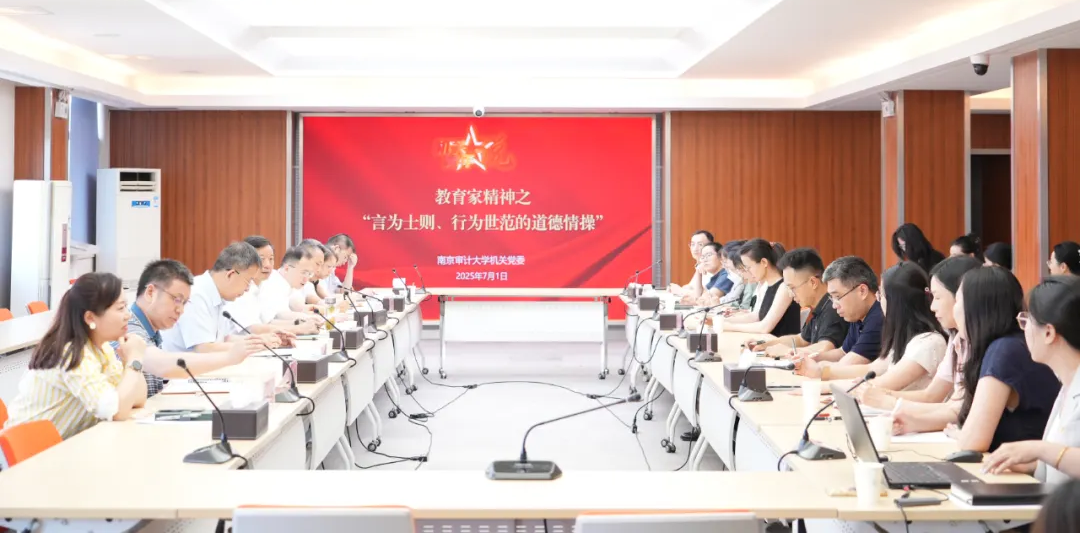 省纪委监委派驻南京审计大学纪检监察组办公室副主任徐军,发展改革办公室兼高水平大学建设办公室副主任、高等教育研究所副所长江萍作为党员代表主讲了微党课,分别分享了入党25周年的感想;国际合作与交流办公室支部周达勇、期刊社支部李思远和党政办公室支部蒋一凡三位青年干部代表,围绕“教育家精神之言为士则、行为世范的道德情操”开展了交流。