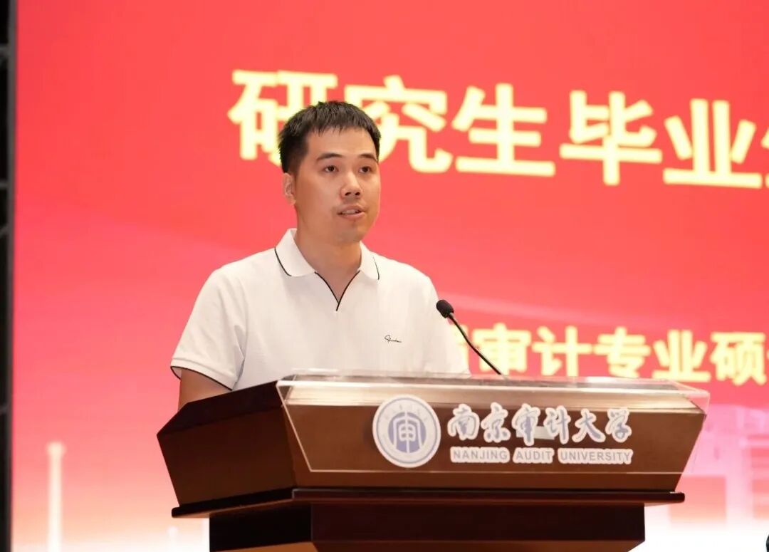 毕业生代表、国家审计学院2022届审计专硕毕业生、现任江苏省审计厅财务处四级主管汤宏飞分享了他的学习与工作体会。他希望大家珍惜时光,厚积薄发,尝试构建跨学科的知识体系;心怀家国,志存高远,将个人理想融入国家发展的大局;接纳波动,为生活留白,形成可持续的成长之道。