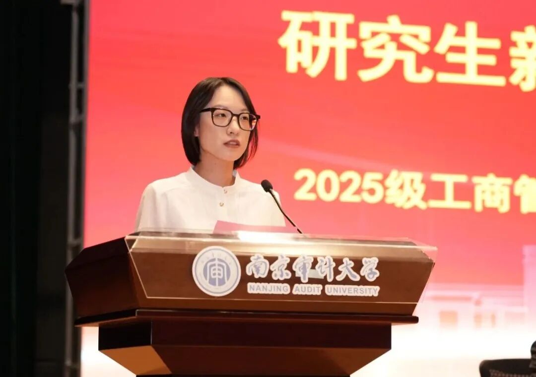 新生代表、商学院2025级博士研究生王雨萌同学讲述了她跨越千里来到南审求学的心路历程,表示“南审人”将成为自己最引以为傲的称号。她号召大家在南审这篇热土上,不负韶华、不负时代、不负国家,真正成长为肩负使命、勇于担当、敢闯未来的优秀审计工作者。