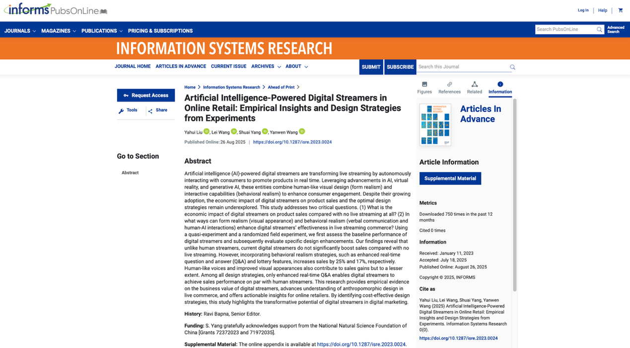 近日,我校商学院教师刘亚慧与Lei Wang教授(Indiana University)、杨帅教授(东华大学)、及Yanwen Wang教授(University of British Columbia)合作的《Artificial Intelligence-Powered Digital Streamers in Online Retail: Empirical Insights and Design Strategies from Experiments》在线发表于《Information Systems Research》。