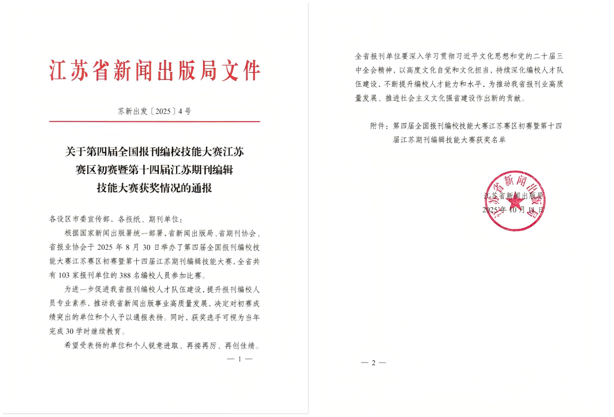 近日,第四届全国报刊编校技能大赛江苏赛区初赛公布获奖结果,我校期刊社黄燕获个人奖一等奖,由高婷、李思远、苗竹青组成的团队获团体奖二等奖。
