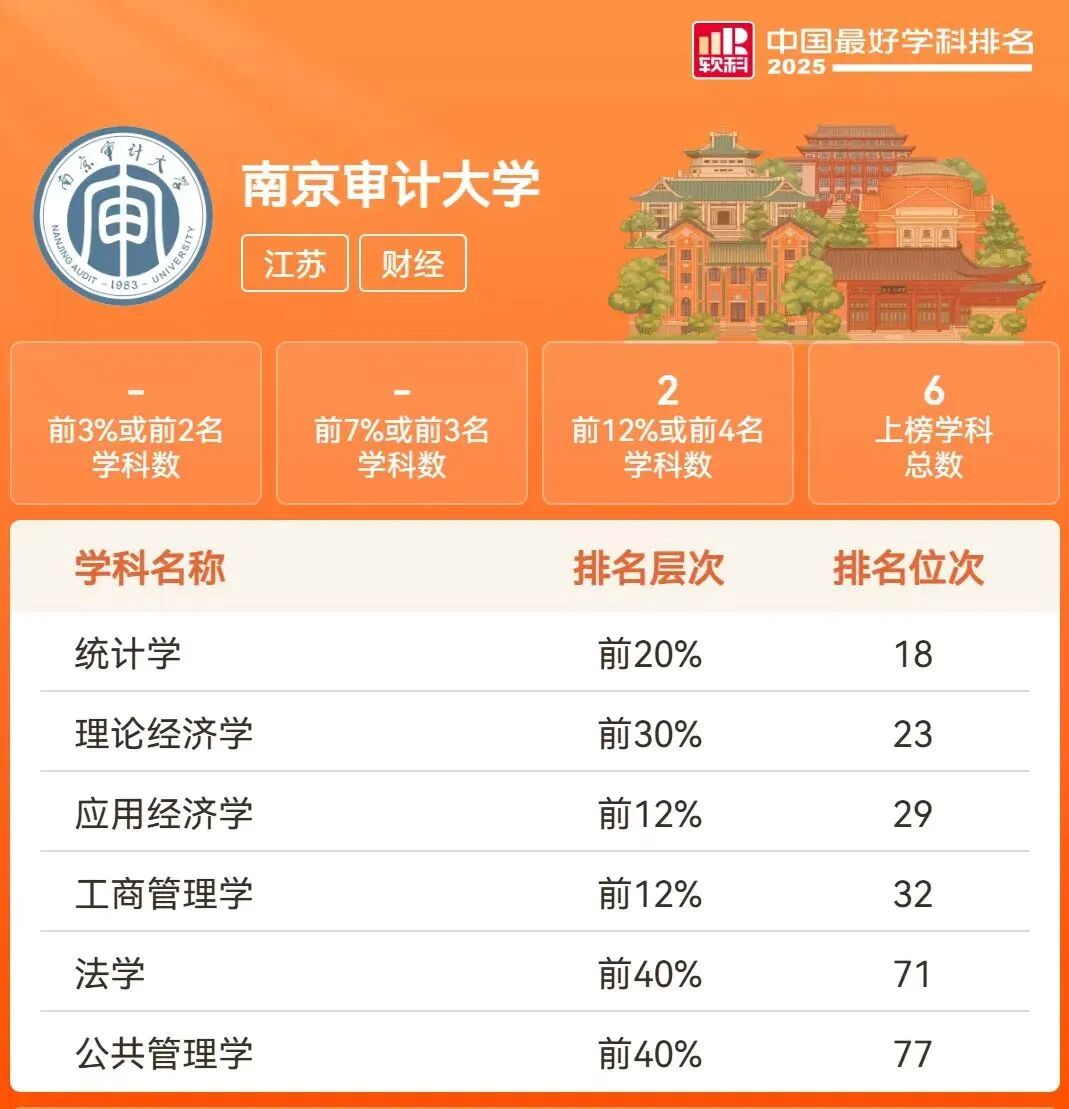 10月15日,高等教育评价专业机构软科发布“2025软科中国最好学科排名”。我校现有8个硕士及以上学位授权一级学科,本次有6个学科上榜,上榜率75%,涵盖经济学、法学、理学、管理学等多个学科门类。应用经济学、工商管理学、统计学、理论经济等4个学科位居江苏省前三名,其中,统计学首次进入榜单前20%,位列江苏省第一名。近日,教育部公布了最新学位授予单位(不含军队单位)自主设置二级学科名单,我校审计学自设目录外二级学科在列,意味着学校可以在工商管理学一级学科博士点下单独招收审计学博士,实现审计学本硕博人才贯通式培养。