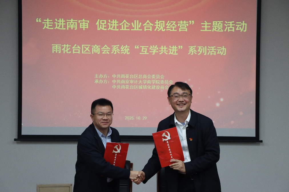 随后南京审计大学商学院党委与雨花台区总商会党委举行了党建结对共建签约仪式。根据协议,双方将共建“党建 + 产业链”联盟,推动学科团队与雨花台区企业深度对接,实现技术成果转化、人才实习实训与企业用人需求的精准匹配。