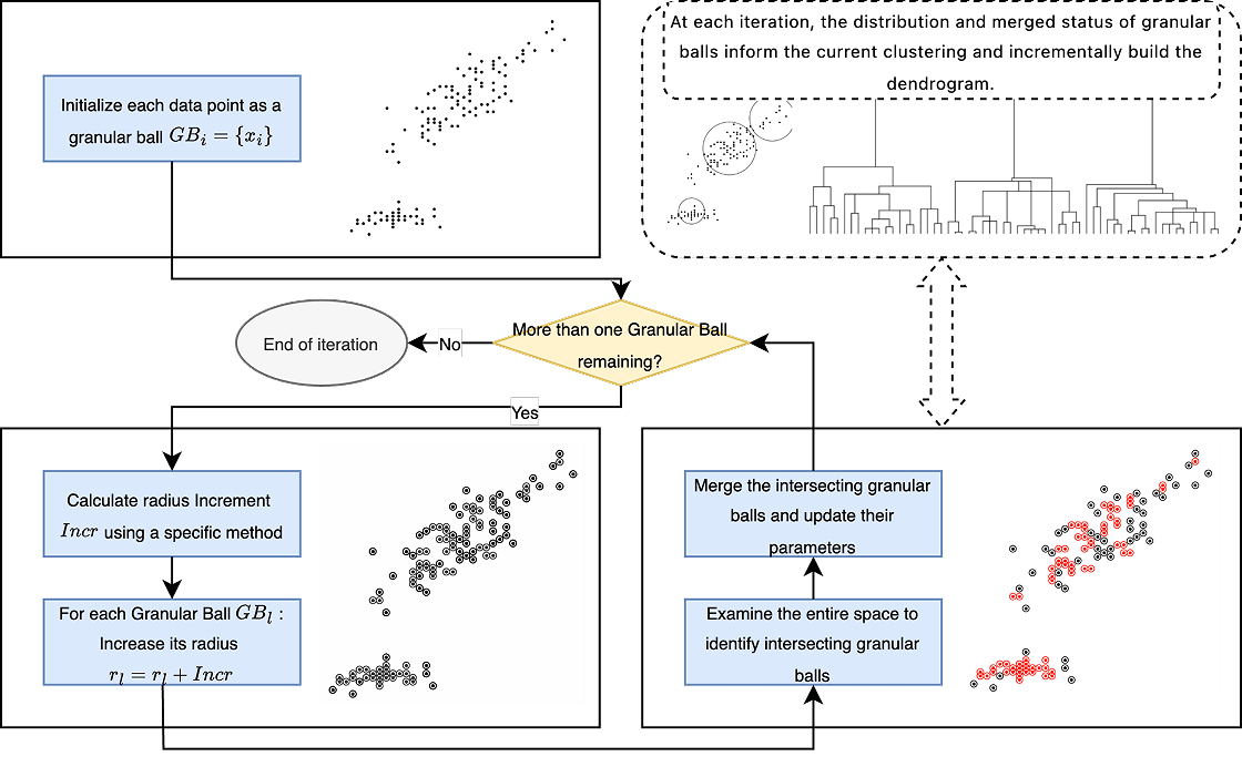 该研究针对传统层次聚类算法计算复杂度高、效率受限的瓶颈,创新性地引入粒球计算思想,提出了两种新型层次聚类算法:FI-GBHC与PB-GBHC。该方法以“粒球”作为聚类基本单元,将数据点聚合为几何结构明确的粒球,并依据粒球之间的相交关系进行层次合并,显著降低了算法的计算开销。同时,算法能够构建多叉树形式的聚类层次结构,更贴合复杂数据的真实分布特征。