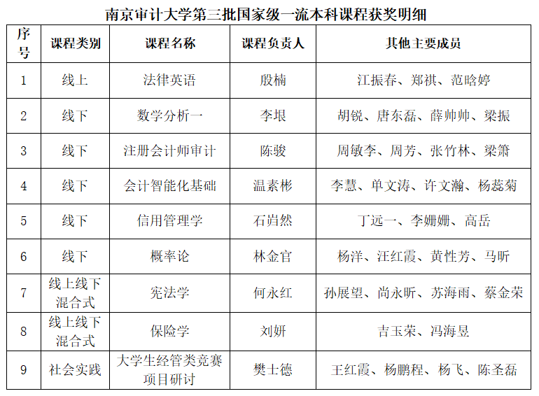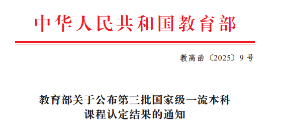 近日,教育部发布了《教育部关于公布第三批国家级一流本科课程认定结果的通知》(教高函[2025]9号),我校共有9门课程入选,其中线上一流课程1门,线上线下混合式一流课程2门,线下一流课程5门,社会实践一流课程1门。截至目前,我校共有国家级一流本科课程23门。