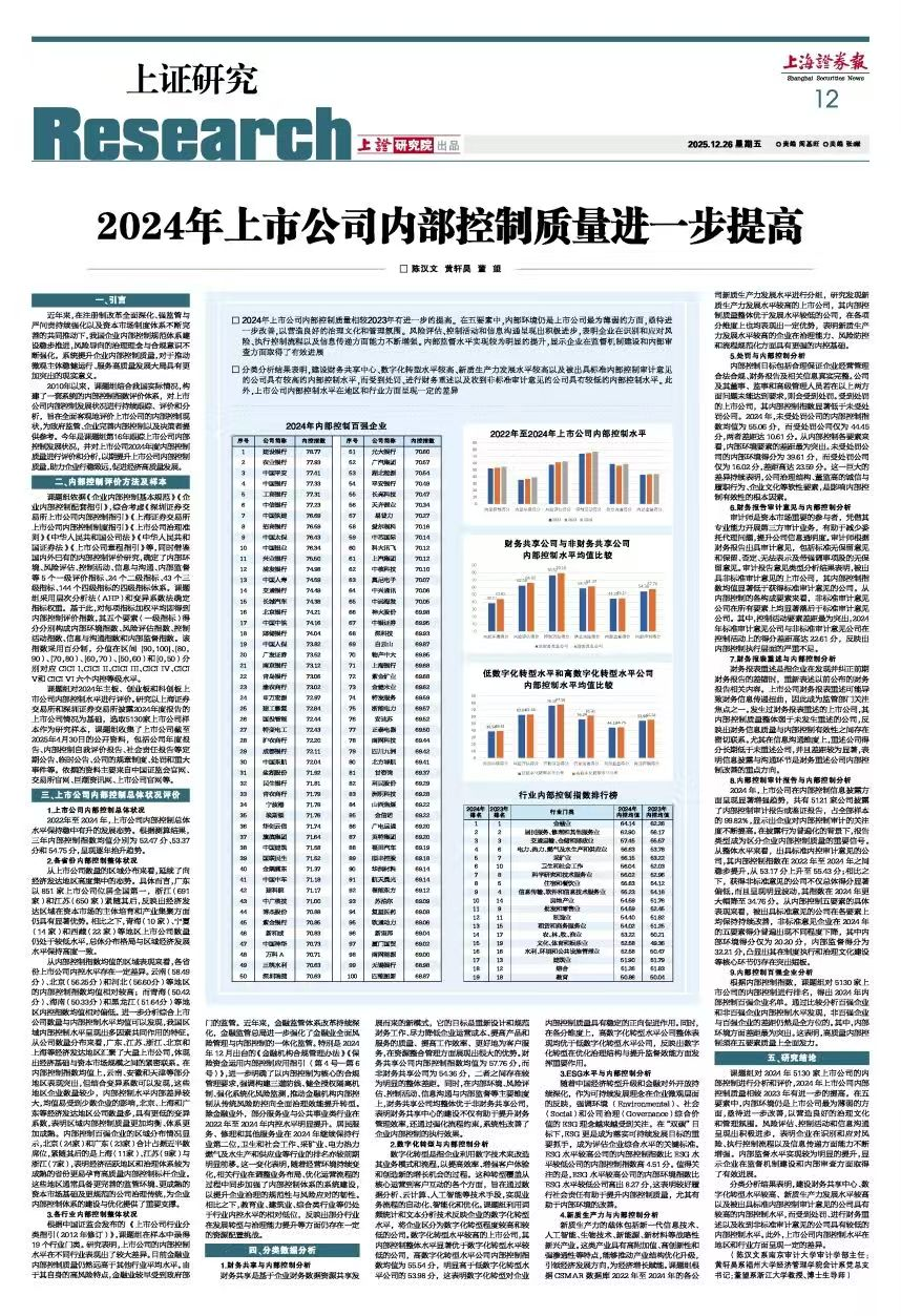 12月27日,新华社客户端转发了《上海证券报》发布的我校审计学部主任陈汉文教授团队的报告《2024年上市公司内部控制质量进一步提高》,当天浏览量超100万次。这是该团队连续十六年发布“中国上市公司内部控制评价报告”,也是其承担的教育部哲学社会科学研究重大课题攻关项目的重要研究成果之一。
