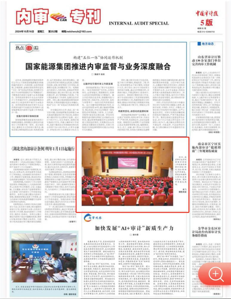 9月25日,中内协内部审计学院举行2024级新生开学典礼。中国内部审计协会会长茅东萍基于内部审计专业的行业需求和中国式内部审计事业发展作线上致辞,南京审计大学党委常委、副校长姜海基于全国教育大会精神和南京审计大学人才培养定位作现场致辞,全国五一劳动奖章获得者谭丽丽高级审计师基于国有企业集团内部审计实践和内部审计人员能力框架作现场分享,海澜集团原审计总监周美容女士以及南京审计大学各书院领导应邀出席。中内协内部审计学院全体教职工和2024级全体新生参加。开学典礼由南京审计大学审计学部主任、中内协内部审计学院名誉院长陈汉文教授主持。