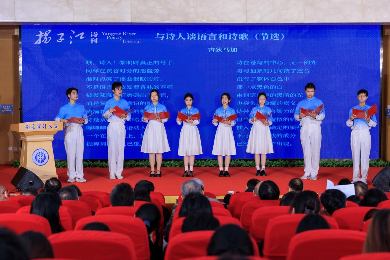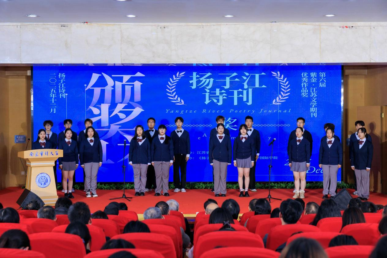 颁奖典礼现场,南京审计大学大艺团合奏了《欢庆序曲》、国际学院主持人队朗诵了吉狄马加的作品《与诗人谈语言和诗歌》(节选),大艺团带来合唱《彩虹》。
