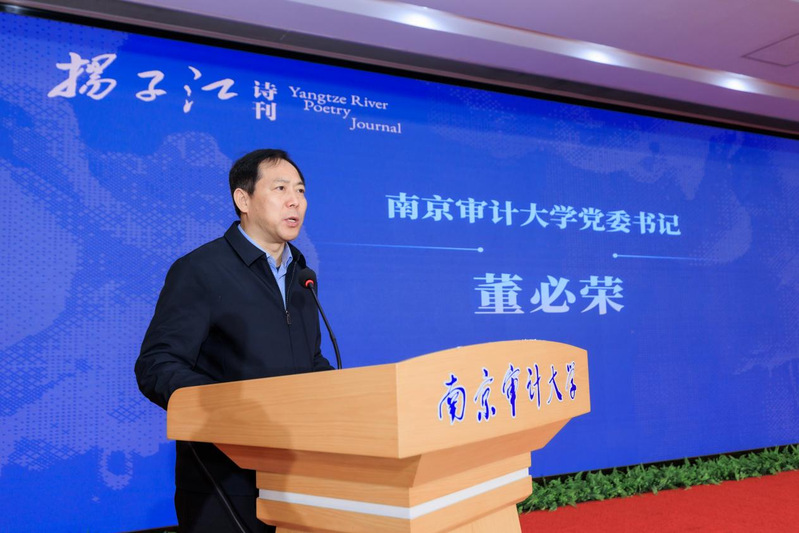 董必荣代表全校师生对与会嘉宾和获奖者表示欢迎与祝贺,并介绍了学校的办学特色与发展成就。董必荣指出,学校始终秉持“特色、质量、国际化”办学理念,近年获批博士学位授予单位并入选江苏高水平大学建设高峰计划,收到习近平总书记给留学生的回信勉励。他特别强调人文教育对审计人才培养的重要性,此次携手省作协举办文学盛会,正是践行这一理念的生动实践。董必荣高度评价《扬子江诗刊》奖对时代书写与精神探索的坚守,认为该奖项既是艺术成就的褒奖,更是社会责任感的彰显。他期待通过本次活动,进一步活跃校园文化,深化校地文教合作,为繁荣社会主义先进文化、建设文化强国贡献南审力量。