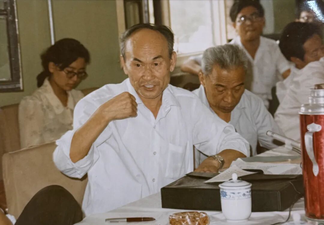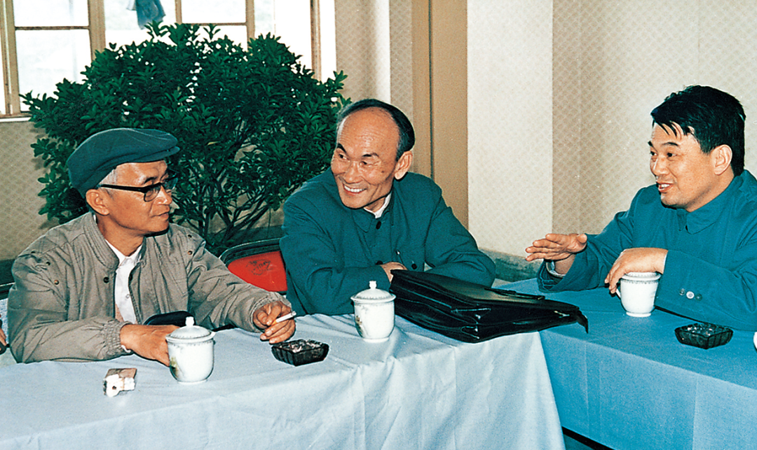1987年,时任副审计长李金华(右一)与程能润(中)等专家教授座谈南京审计学院审计专业课程设置问题