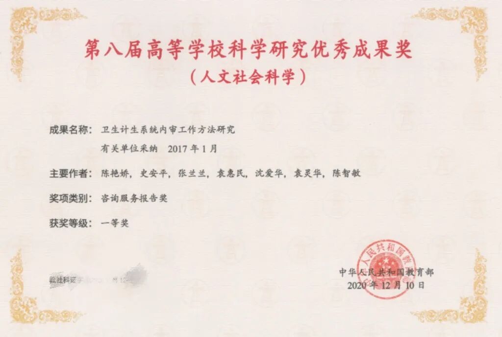 2020年12月,《卫生计生系统内审工作方法研究》荣获教育部高等学校科学研究优秀成果奖(人文社会科学)一等奖,这是自1995年教育部设立该奖项以来审计领域唯一一个全国一等奖。