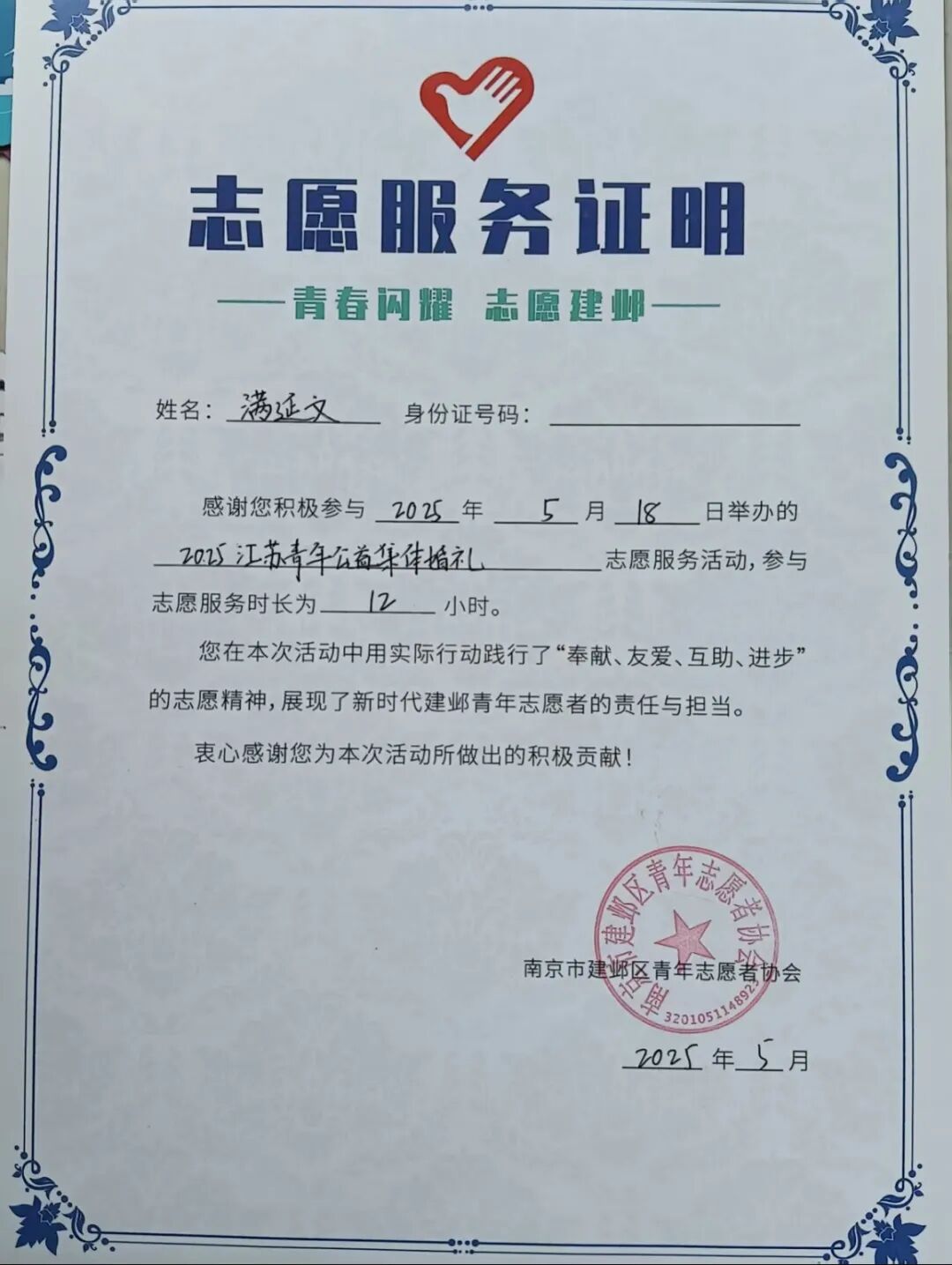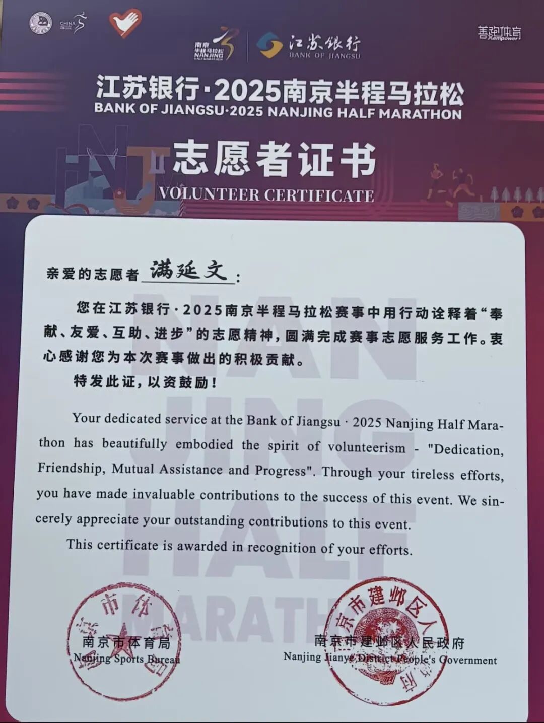 社会实践教会我的不只是做项目、写报告,更是把“帮助”变成一种习惯。大学三年,我的志愿时长超过330小时,参与过南京马拉松、浦口马拉松等大型志愿服务活动30余项,曾任南审图书馆长期志愿者。