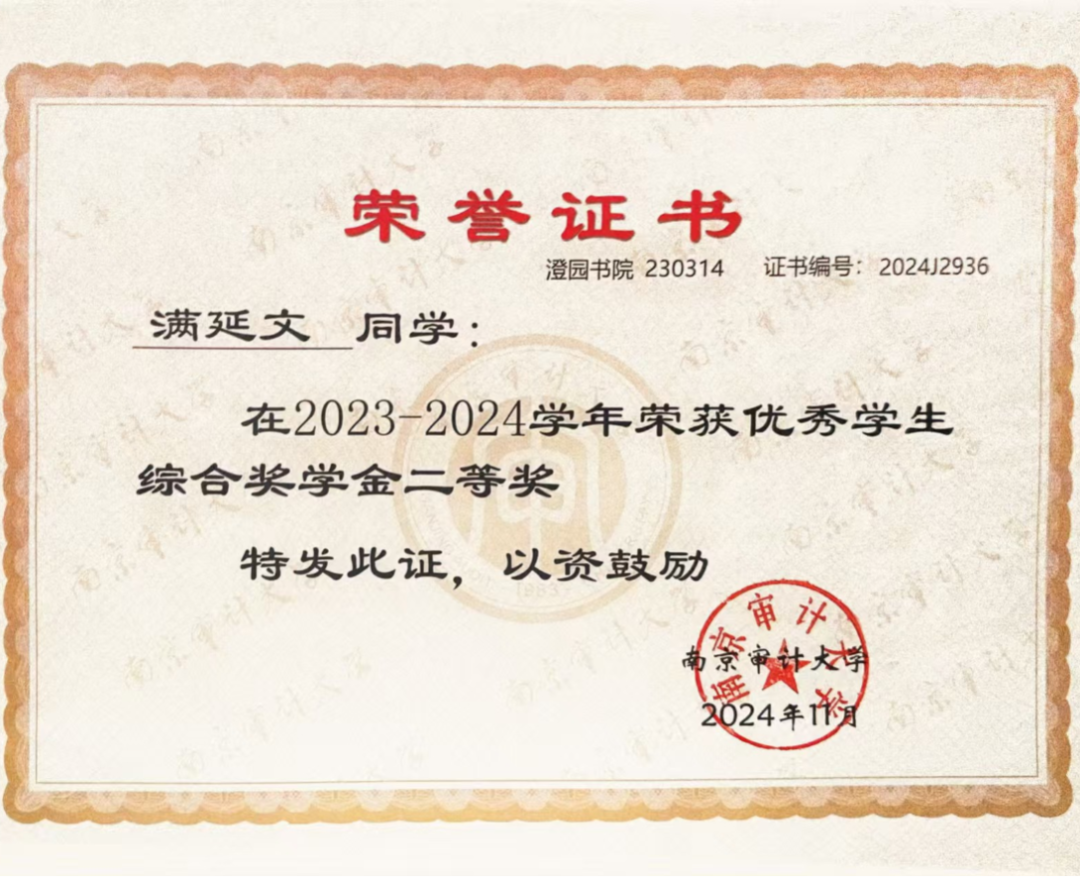 数学一直是我的短板,看着能报补习班的同学,我心里非常羡慕,但家里负担多个孩子的生活费都已经很困难,实在不能拿出额外的钱来上补习班。好在高中获得的国家资助金,那笔钱不多,却够交学费、买复习资料,让我不再为生活费分心。这是我第一次真切感受到,有人在托着我往上走。我深知要更加努力才能对得起这份资助,于是我比别的同学起得更早去背单词,睡得更晚去刷数学题......最终,我拿到了南京审计大学的录取通知书。